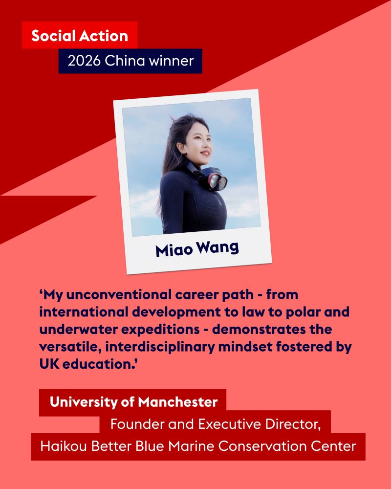 On the evening of 6 December, the China ceremony for the "2026 Study UK Alumni Awards” by the British Council was held in Beijing. Wang Miao, an alumna of The University of Manchester and the Founder & Executive Director of Haikou Better Blue Marine Conservation Centre, was honoured with the "Social Action Award" in recognition of her outstanding contributions to marine conservation, demonstrating the University's profound commitment to nurturing global civic leaders.